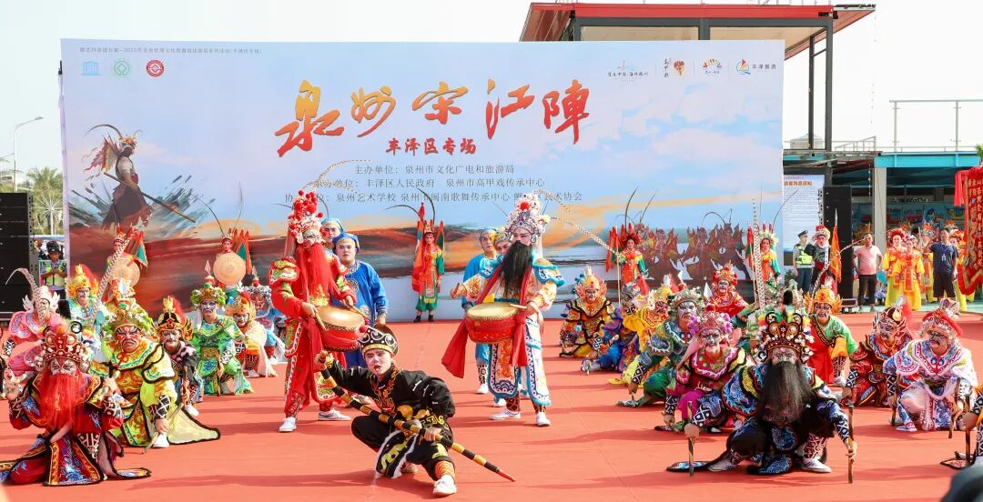 本次展演采用“固定点展示+行进式互动”相结合的形式,还原了《水浒传》戏曲人物造型,呈现了刣狮、南拳等多种南派绝技,十几种宋江阵经典阵法在海天之间铺展,重现泉州“棍棒手扑,妙绝天下”的民俗风采。