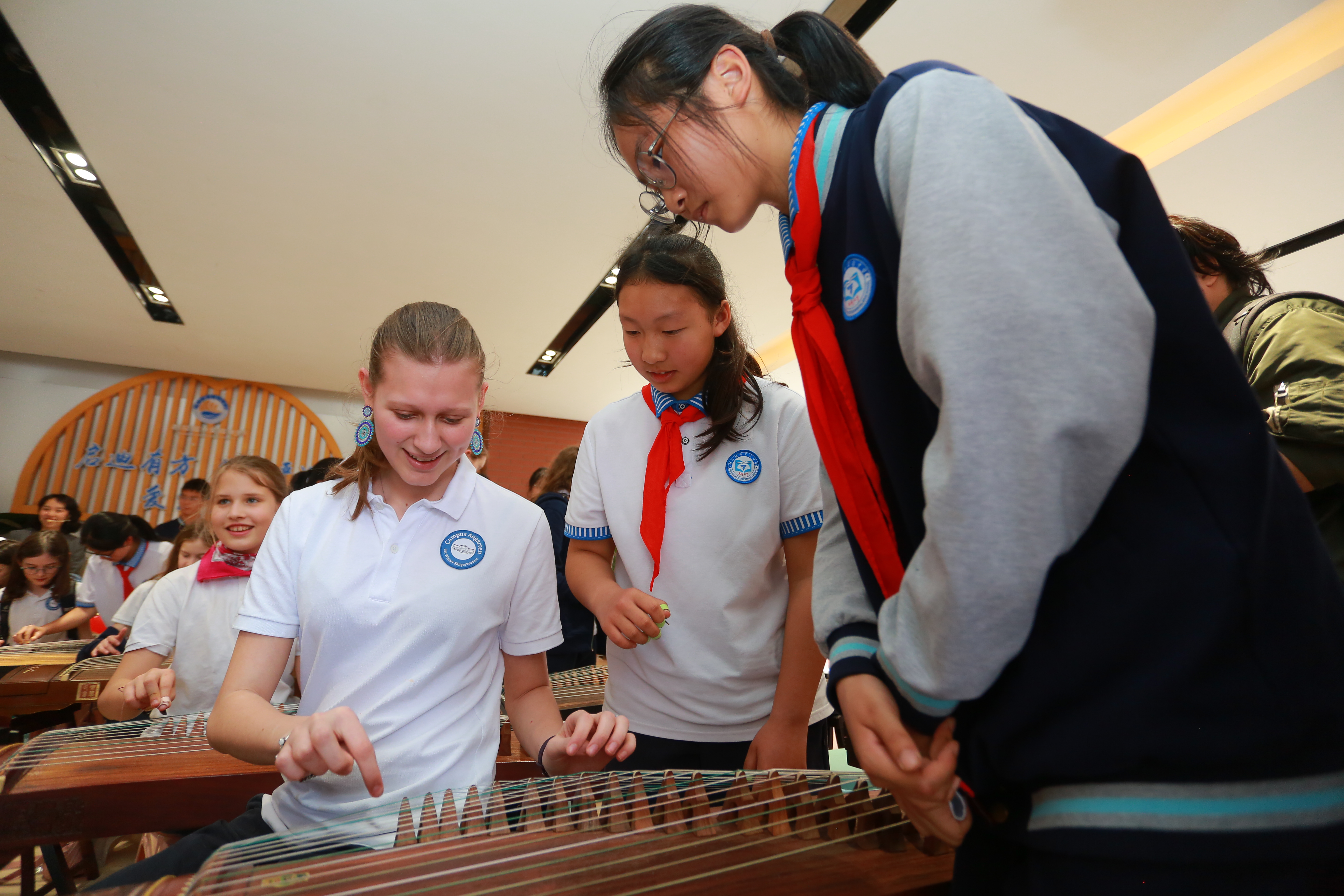 在都江堰市实验中学,东道主们以极具中国韵味的迎宾仪式热情接待了远道而来的客人。校园里,乐器悠扬奏响,古筝、竹笛交相辉映;校园美育成果展板上,一幅幅书画、一件件手工作品生动呈现。
